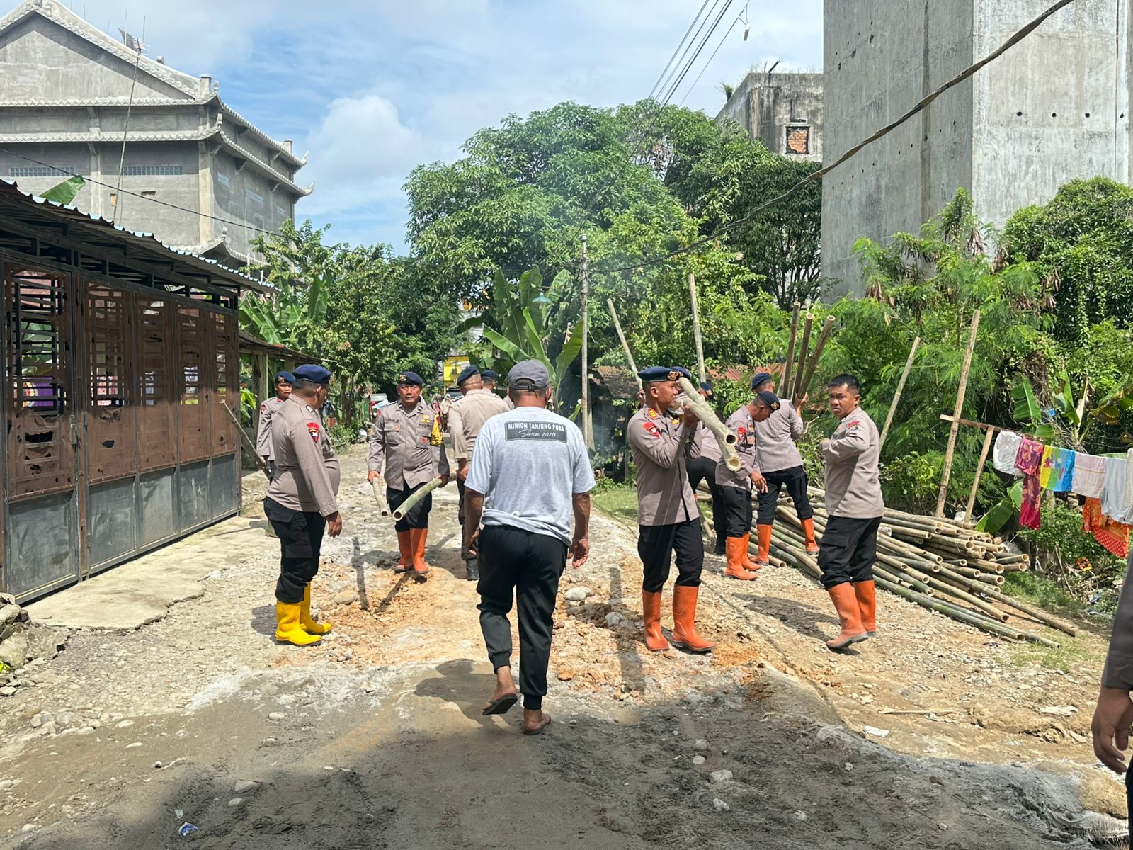 Proses perbaikan berlangsung kolaboratif; personel Brimob bergotong-royong bersama masyarakat, tokoh pemuda, dan perangkat desa. Warga yang tinggal di sekitar tanggul ikut mengangkat material timbun, menata cerocok bambu, dan memastikan jalur akses kembali bisa dilalui.