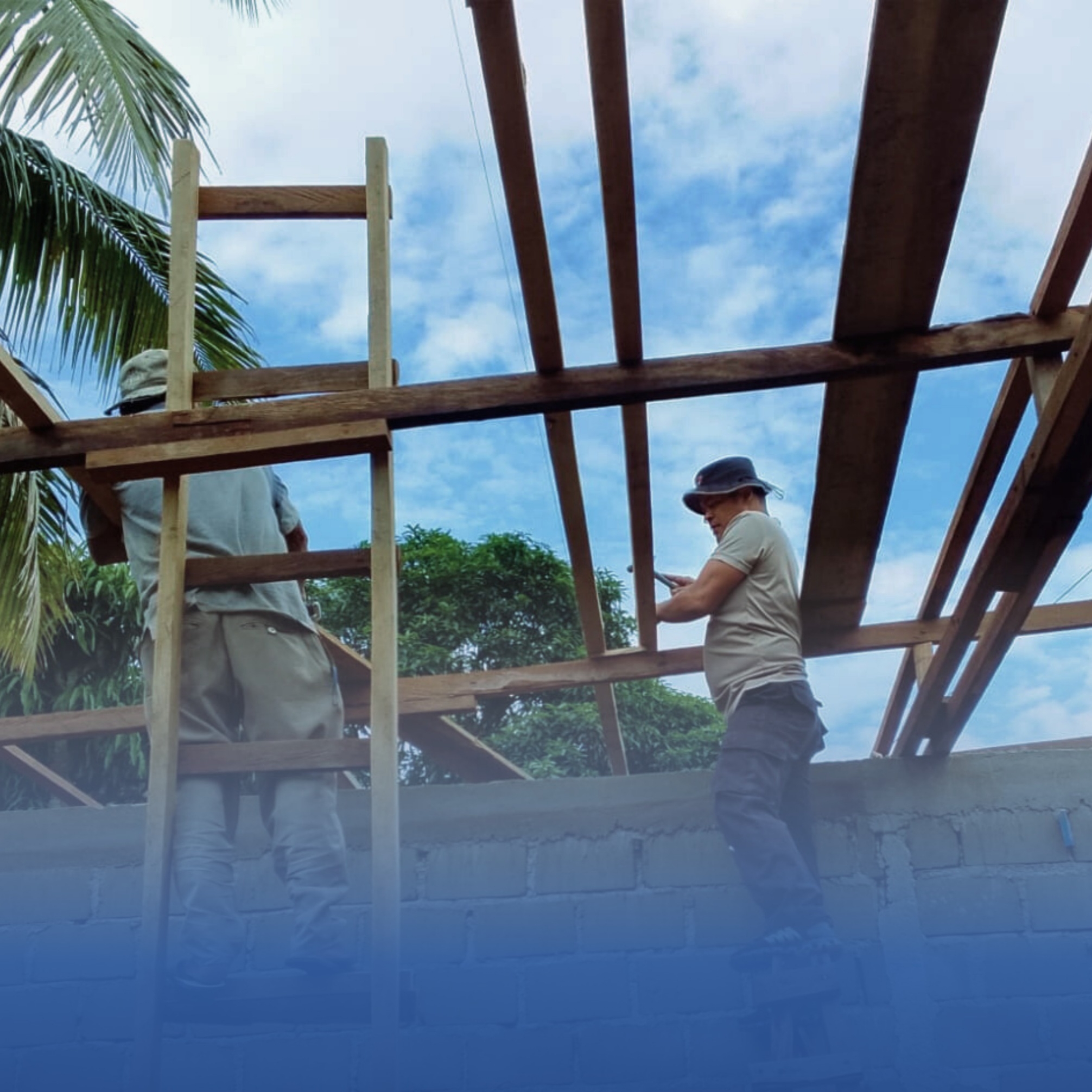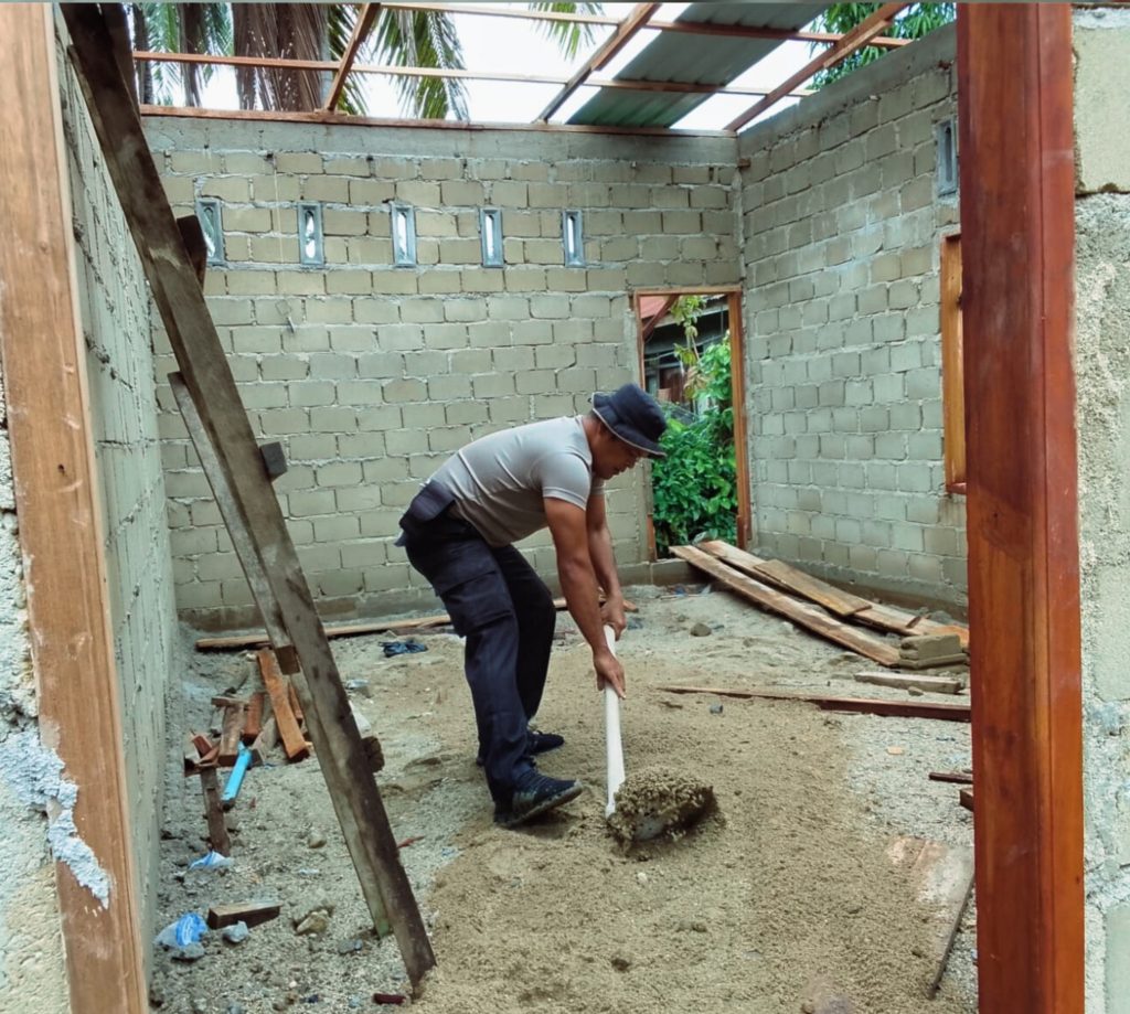 Sejumlah pekerjaan fisik dilakukan secara bertahap, mulai dari menaikkan rangka atap, pembersihan sisa material kayu, hingga perataan pondasi menggunakan pasir. Hingga saat ini, progres pembangunan telah mencapai sekitar 55 persen dan ditargetkan terus berlanjut hingga rumah siap ditempati.