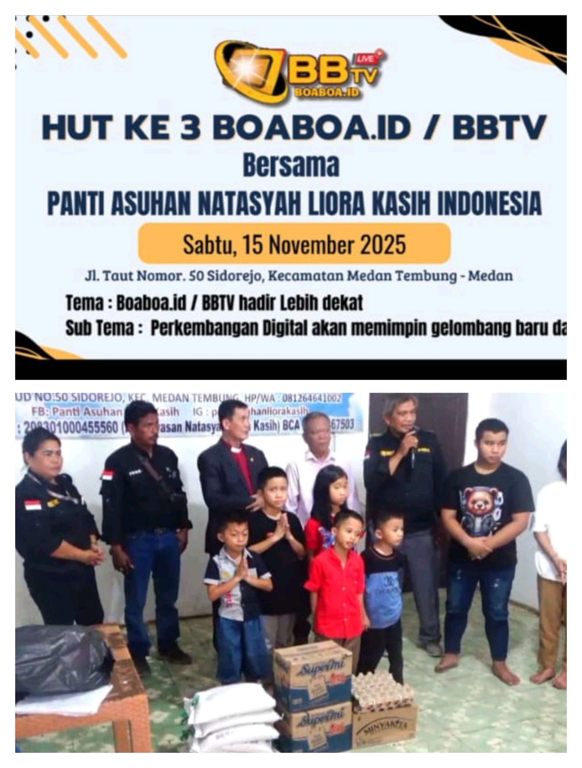 Medan – Perayaan Hari jadi ketiga tahun Media boaboa.id / BBTV 16/11/2025 berjalan sukses dan meriah. Perayaan ulang tahun Boaboa.id / BBTV ini dilaksanakan secara sederhana di Panti Asuhan Natasya Liora Kasih Indonesia yang ada di Jl. Taud Nomor 50 Sidorejo Kecamatan Medan Tembung.