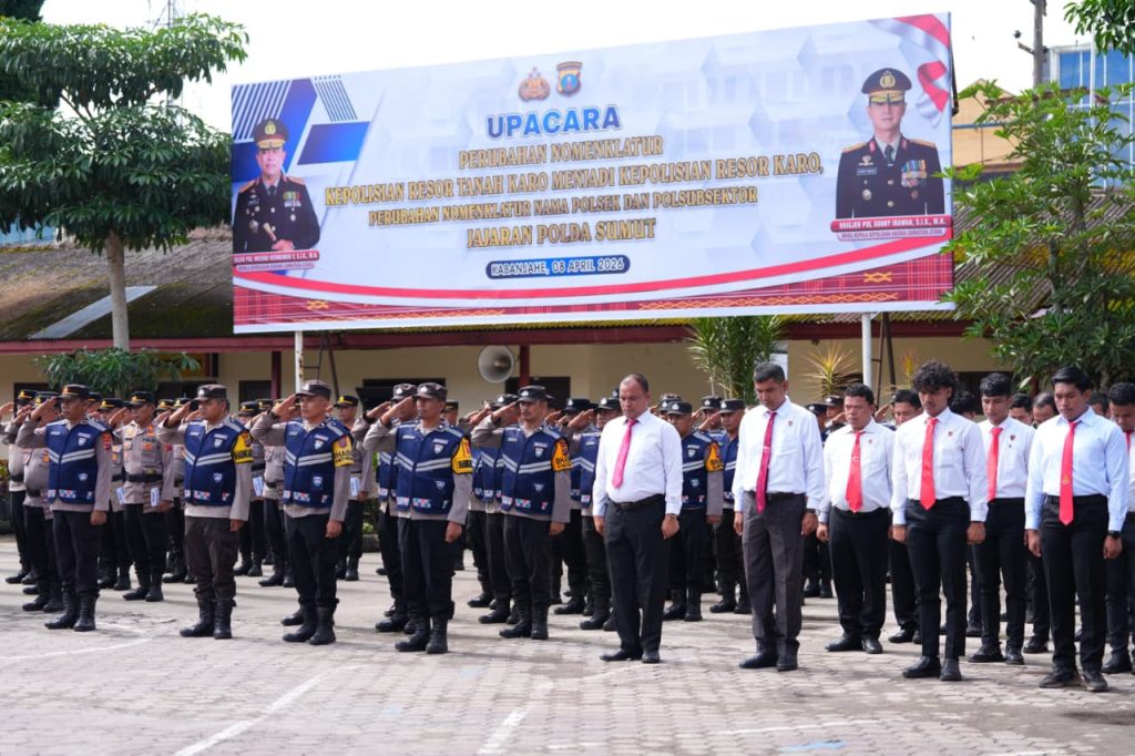 KARO – Kapolda Sumatera Utara Irjen Pol Whisnu Hermawan Februanto memimpin langsung upacara perubahan nomenklatur Polres Tanah Karo menjadi Polres Karo di Lapangan Apel Mapolres Karo, Kabanjahe, Rabu (8/4/2026).