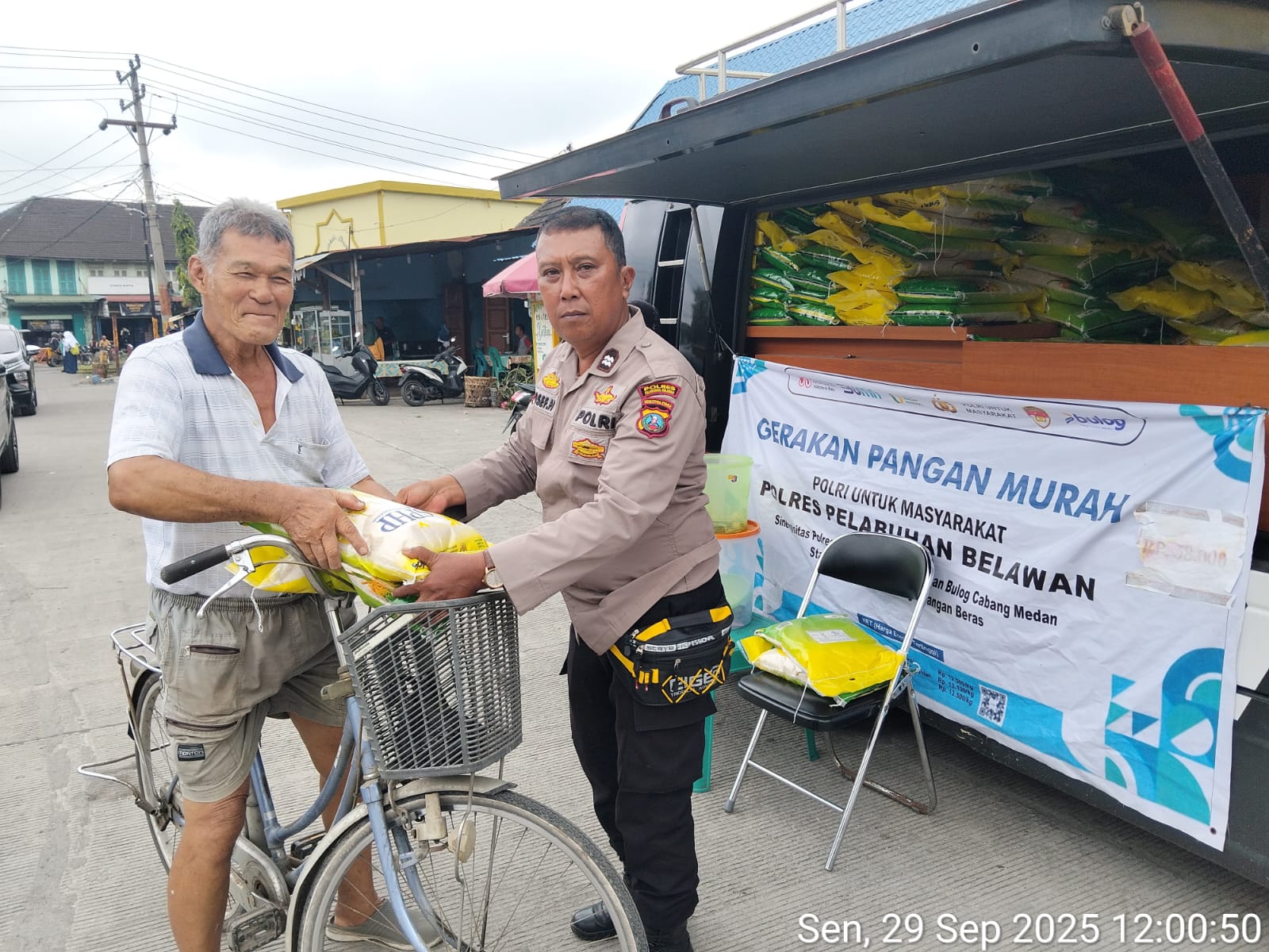 Belawan – Polres Pelabuhan Belawan pada Senin, 29 September 2025 melaksanakan kegiatan Gerakan Pangan Murah Polri dengan menjual beras SPHP dari Bulog kepada warga di Jalan Selebes, Kelurahan Belawan II. Kegiatan ini disambut antusias masyarakat yang berbondong-bondong membeli beras berkualitas baik dengan harga terjangkau.