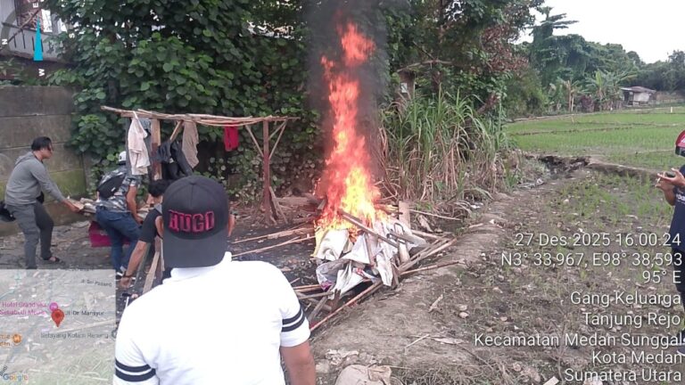 Medan – Unit Reskrim Polsek Medan Sunggal menggerebek dan membakar gubuk sarang narkoba Minggu (28/12/2025).