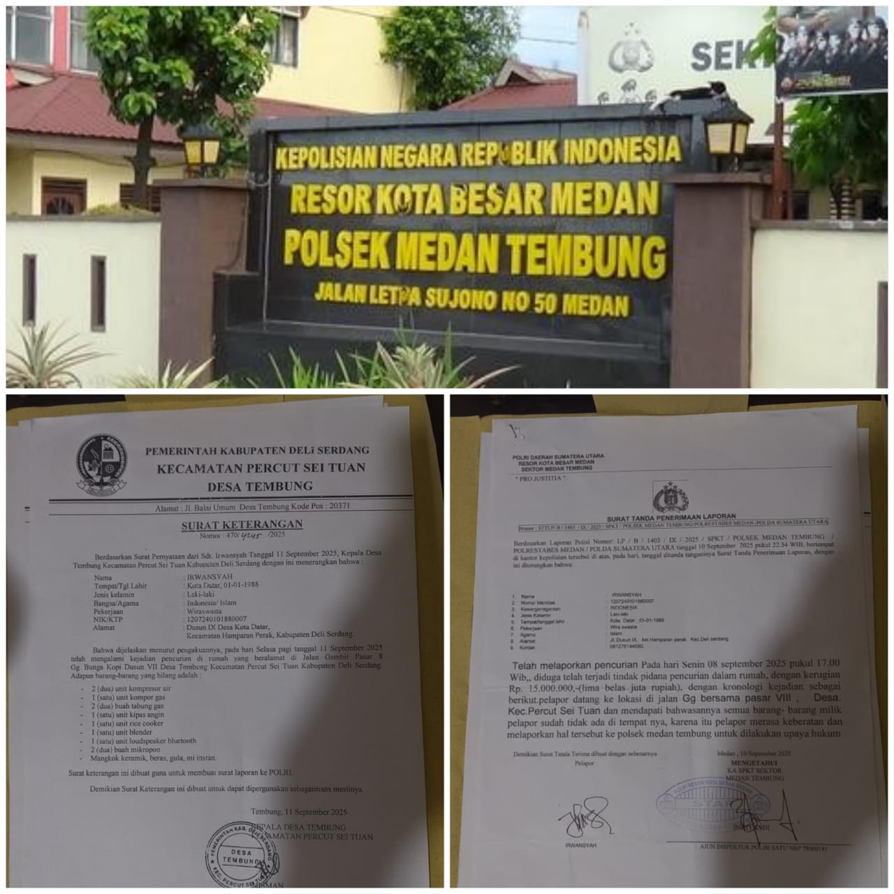 Medan, 9 Oktober 2025 — Seorang warga bernama Irwansyah (37), warga Jalan Dusun IX, Kelurahan Hamparan Perak, Kecamatan Deli Serdang, mengeluhkan penanganan kasus pencurian yang dilaporkannya di Polsek Medan Tembung. Ia menilai penyidik berinisial Aipda AS tidak profesional dalam menangani laporan tersebut.