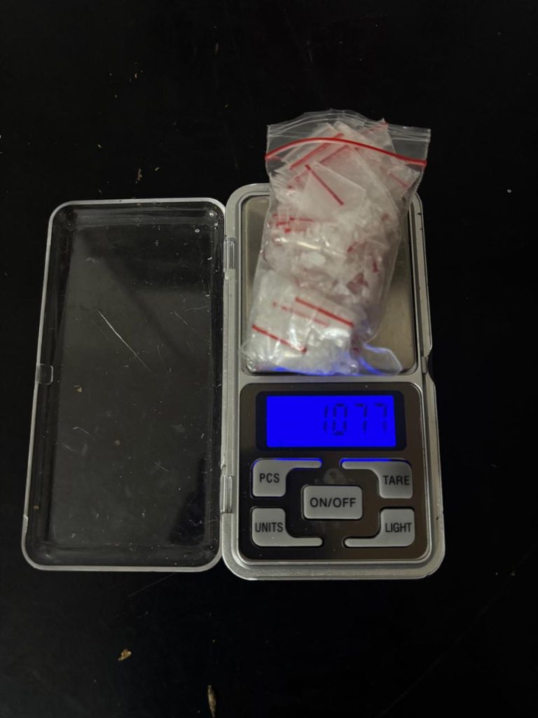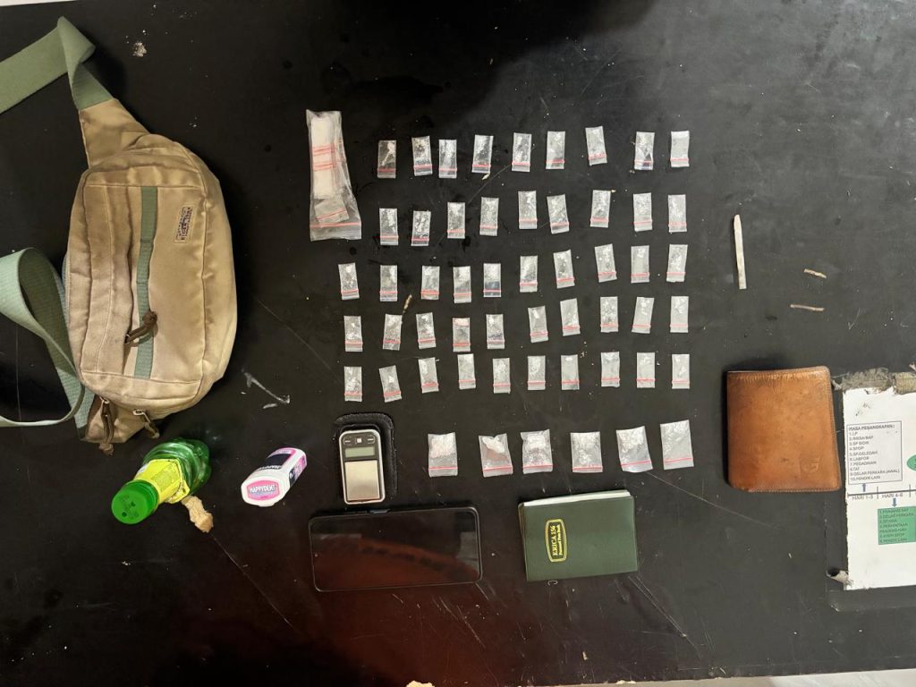 Dari dalam tas sandang berwarna krem yang dibawa pelaku, petugas menemukan 54 plastik klip berisi sabu — terdiri dari 48 plastik klip kecil dan 6 plastik klip sedang, dengan total berat brutto mencapai 10,77 gram. Tidak hanya itu, petugas juga mengamankan timbangan elektrik, kaca pirex, alat hisap sabu dari botol plastik, buku catatan, hingga satu unit HP merek Realme berwarna biru yang diduga digunakan untuk komunikasi transaksi narkoba.