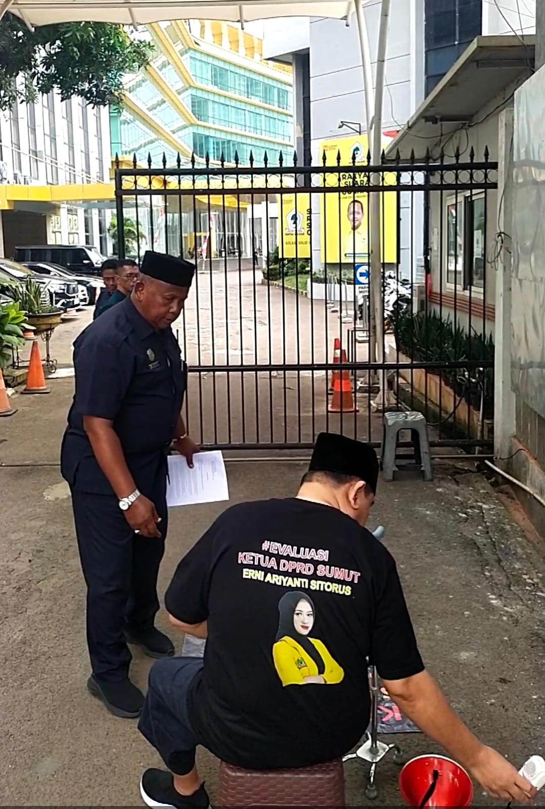 JAKARTA, 8/9/2025 — Mengenakan kaus hitam bertuliskan “Evaluasi Ketua DPRD Sumut Erni Ariyanti Sitorus” dan bergambar foto Ketua DPRD Sumut, Erni Ariyanti, Saharuddin, Wakil Sekretaris Bidang Kerja Sama Ormas DPD Partai Golkar Sumatera Utara, kembali menggelar aksi tunggal yang mengundang perhatian publik. Kali ini, aksinya berlangsung di jantung politik nasional, tepat di depan Kantor DPP Partai Golkar dan Gedung DPR RI, Jakarta, Senin (8/9/2025).