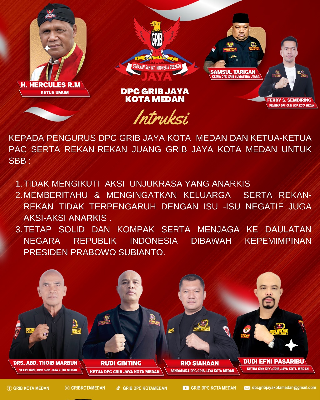 Instruksi tersebut dikeluarkan untuk memastikan agar GRIB Jaya Kota Medan tetap fokus pada peran organisasi dalam menjaga kondusivitas dan persatuan bangsa.