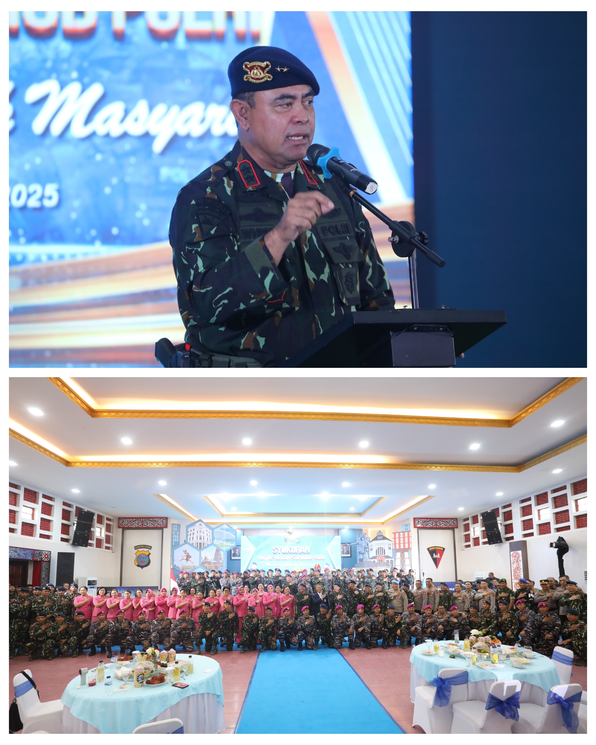 Kapolda Sumatera Utara, Irjen Pol Whisnu Hermawan Februanto, S.I.K., M.H. hadir langsung dan menyampaikan sambutan yang sarat pesan motivasi, penghormatan, serta apresiasi mendalam atas keberhasilan dan pengabdian Korps Brimob selama delapan dekade.