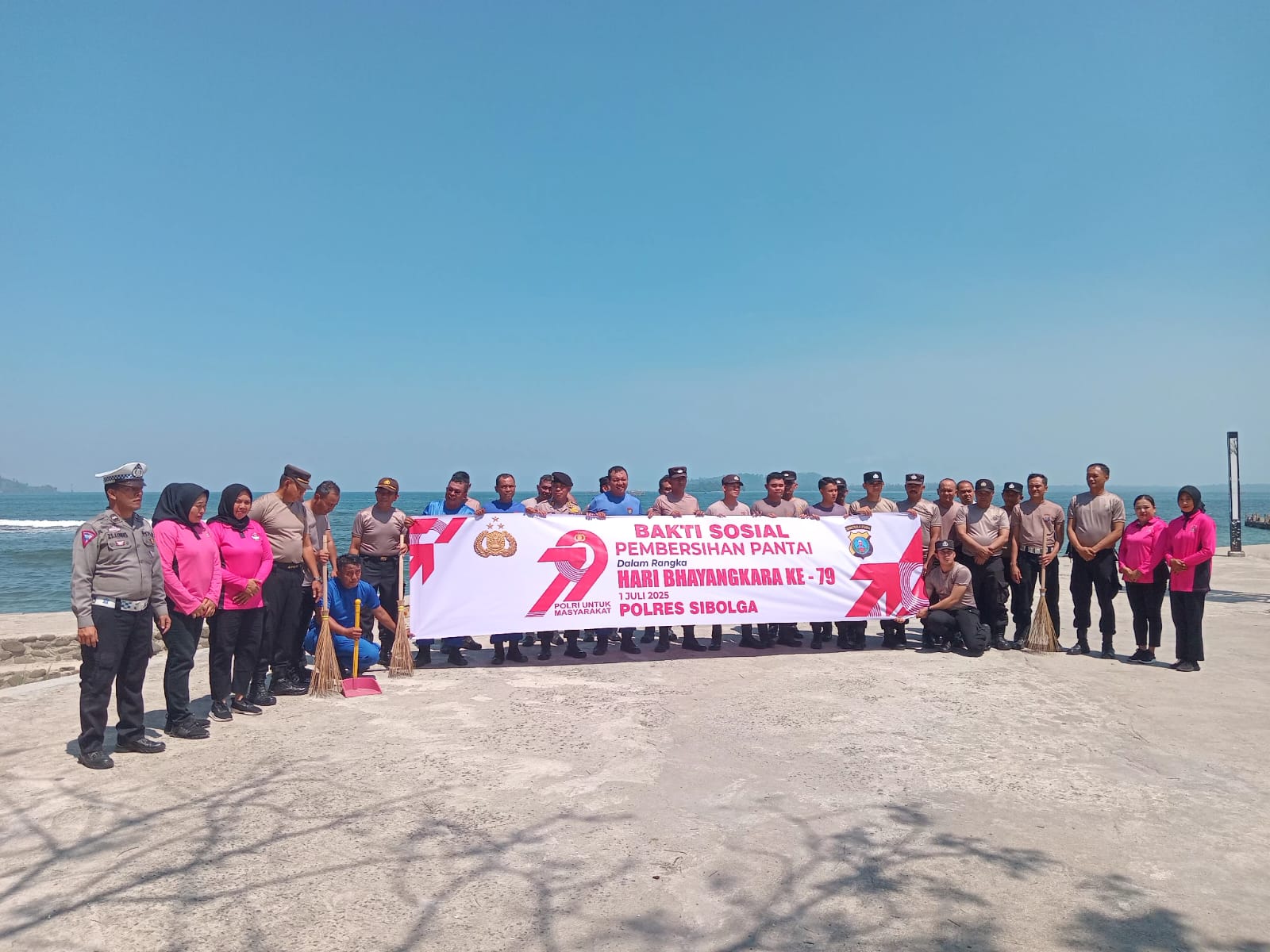 SIBOLGA – Pada hari Senin, 30 Juni 2025, pukul 11.00 WIB, Kapolres Sibolga AKBP Eddy Inganta, SH, SIK, MH, bersama Personil Polres Sibolga dan Pengurus Bhayangkari Cabang Sibolga, dalam Rangka Hari Bhayangkara Ke-79 Tahun 2025, melaksanakan Bakti Sosial “Bersih Pantai” yang berlangsung di Pelabuhan Lama Sibolga Jalan Com. Yos Sudarso Kelurahan Kota Baringin Kecamatan Sibolga Kota, Kota Sibolga. Kegiatan ini dilaksanakan merupakan bentuk kepedulian Polres Sibolga dan Bhayangkari Cabang Sibolga menjaga kebersihan lingkungan hidup khususnya Objek Wisata Pantai yang berada di Wilayah Kota Sibolga, selain itu bertujuan untuk meningkatkan Kesadaran Masyarakat mengenai pentingnya menjaga kebersihan dan kelestarian laut.