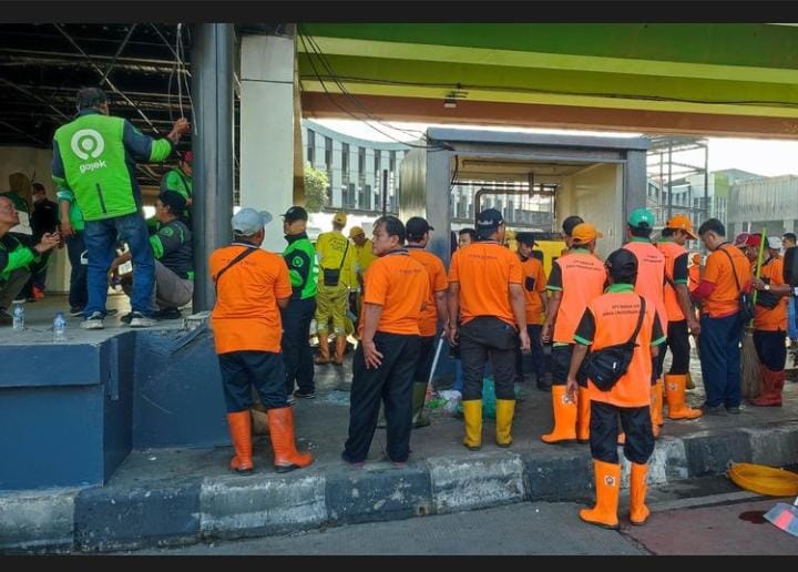 Jakarta – Suasana kebersamaan terlihat di Halte Transjakarta Senen Sentral pada Senin pagi (1/9/2025). Petugas PPSU DKI Jakarta, petugas Transjakarta, Dinas Pemadam Kebakaran (Damkar), sejumlah pengemudi ojek daring (ojol), hingga warga sekitar bergotong royong membersihkan halte yang terbakar pada Jumat (29/8/2025).