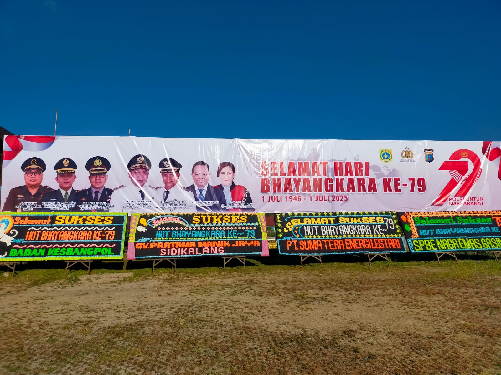 Salak // Papan Bunga sebagai Bentuk Apresiasi dan Ucapan Selamat HUT Bhayangkara Ke – 79 Tahun 2025 kepada Polri Khususnya Polres Pakpak dan Testimoni dari masyarakat melalui pesan singkat WhatsApp di Hp sebagai simbol Dukungan masyarakat dan Stackholder yang mendukung kinerja Polri berjejer mengelilingi Lapangan Napasengkut yang merupakan lokasi Upacara HUT Bhayangkara Ke – 79 Tahun 2025 Polres Pakpak Bharat, Selasa 01 Juli 2025 sekira pukul 08.00 s/d 09.00 wib.