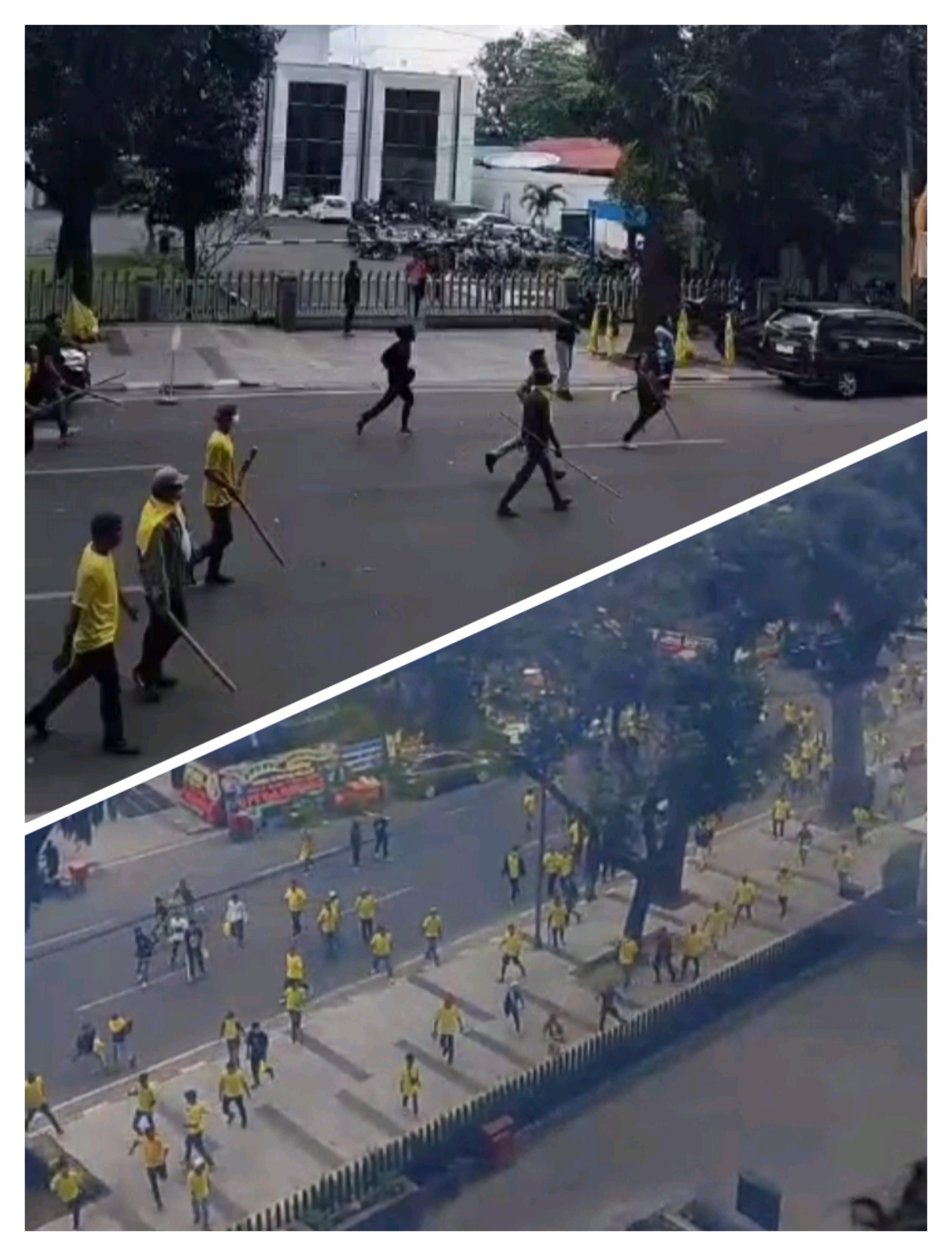 Kericuhan kemudian merembet hingga ke badan jalan di depan hotel yang berada di Jalan Yos Sudarso. Dua kelompok massa yang mengenakan pakaian berwarna kuning dengan atribut Partai Golkar terlibat aksi saling serang. Dalam kejadian itu, sejumlah petasan dinyalakan, bahkan beberapa orang terlihat membawa bambu.
